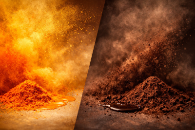 アナトー色素は「黄色〜橙色」で明るさや華やかさを演出します。 一方、ココア色素は「茶色」で深みやコクを表現します。