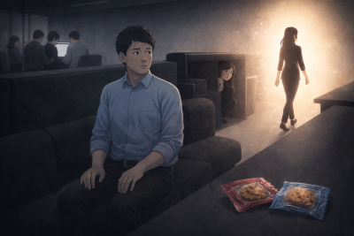 その一方で、別の同僚は何も言わず、自らお菓子を取りに向かっていく。その姿はどこか凛としており、光に包まれているように見えた。最後に確認すると、お菓子は残りわずかになっていた。